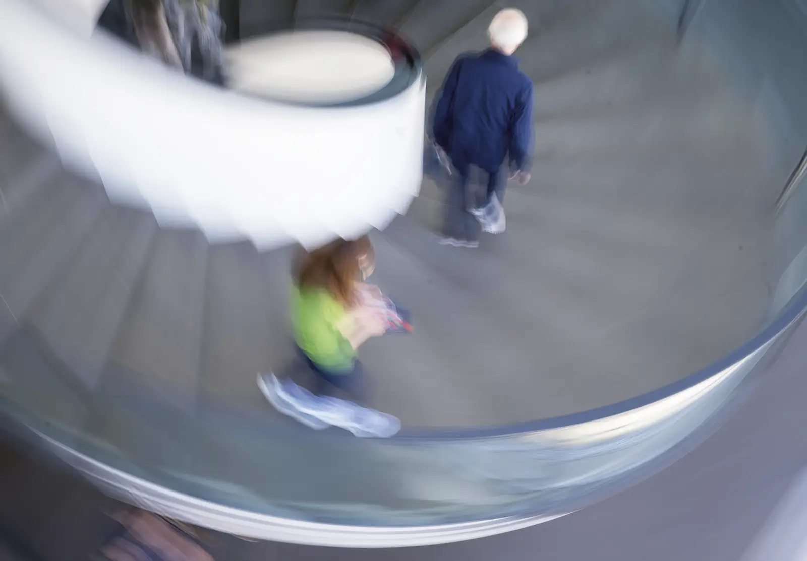 Für Sepp Köppl (CH) war der Prater der magische Ort, um mit Bewegung während des Auslösens originelle Bilder zu schaffen. Besonders schön ist der Farbkontrast zwischen dem Blau des Himmels und den Bewegungsspuren in warmen Gelb- und Rottönen. Nicht die Farbe, sondern die Bewegung dominiert bei dem Treppenfoto von Frank-Walter Schilling (D), der durch eine leichte Drehung der Kamera während des Auslösens die Bewegung der Treppenrundung intensivierte. Defokussierung in der Makrofotografie kann plakative Farbflächen ergeben, mit denen wir die klassische Erwartungshaltung an ein Foto elegant hinter uns lassen. Das jedenfalls lehrt uns das Foto von Helga Lehner (D).
