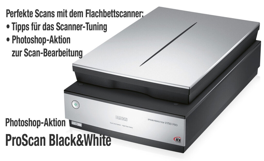 Scanner: Epson V750. Selbstverständlich lassen sich auch andere Flachbettscanner, beispielsweise die Modelle Epson V600, V700, V800 sowie der aktuell noch erhältliche V850 Pro mit der Aktion verwenden, ebenso Modelle anderer Hersteller